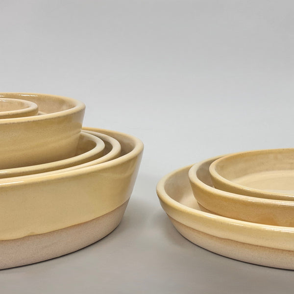• Sandstone Clear – A half-dipped design with clear glaze over speckled sand clay, showcasing the natural texture and warmth of the raw ceramic.