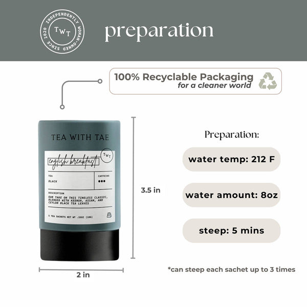 The perfect small gift for any occasion under $10. Each mini tea tube measures 2” wide by 3.5” tall and is made from 100% recyclable rigid paper. Inside, you’ll find 5 eco-friendly tea pyramid sachets that are biodegradable and free of petroleum-based microplastics. Each sachet contains approximately 2–2.5 grams of whole-leaf tea and herbs, and most customers enjoy 2–3 steepings per bag. ENGLISH BREAKFAST: Our specialty in-house blend of robust Ceylon, Assam, and Keemun black tea leaves. A hearty black tea with big whole leaves, not the tea dust you commonly find on grocery shelves... This is America's most popular type of tea for a reason! Our mini tea tubes are perfect small gifts for travel, stocking stuffers, checkout line, grab-and-go options, gift baskets, small tokens of appreciation, Mother’s Day, weddings, birthdays, boutique retail shelves, and more.