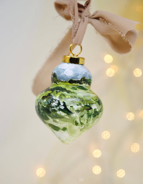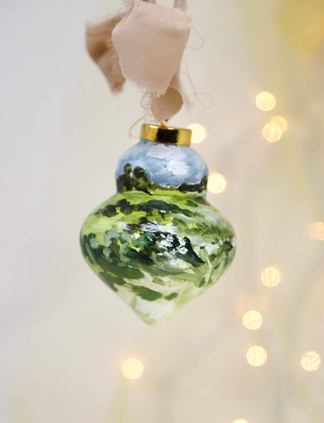 Ceramic ornament hand painted by Shelby Kregel in 2024 with acrylic and watercolor and sealed with polyurethane.