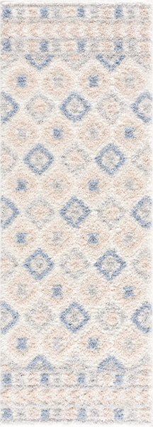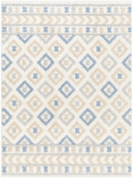 About: The Eivin Pink & Blue Area Rug boasts elegant diamond patterns in plush pile, combining Moroccan and geometric design influences. The beige background highlights soft blue and cream tones, offering a soothing, stylish aesthetic. Its plush texture ensures a soft and luxurious feel underfoot, making it perfect for enhancing any space with both comfort and elegance.