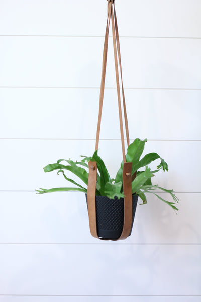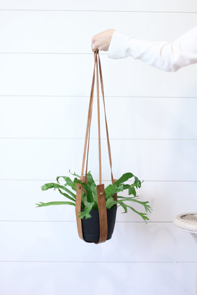 Brighten your space with this Moroccan leather plant hanger featuring brass ring for hanging and handmade detail.
