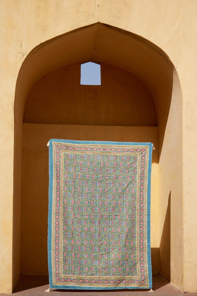 Each throw is handmade, requiring attention from 4 different types of artisans, including wood carvers, block printers, Kantha quiltmakers, and dye specialists. The design is hand-pressed onto pure cotton using hand-carved wooden blocks dipped in dyes. The printed cotton is brought to the homes of Kantha quiltmakers, who hand-stitch the cotton sheet onto a cotton base to create the final throw. Our cotton throws are made in small batches. Due to the handcrafted nature of this item, expect slight variations in the appearance of each unique piece. - 100% Cotton - Size: 54" x 84" - Made in India - Ships from California