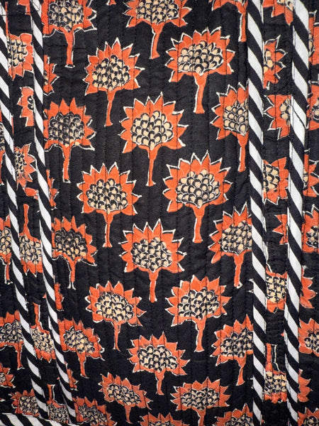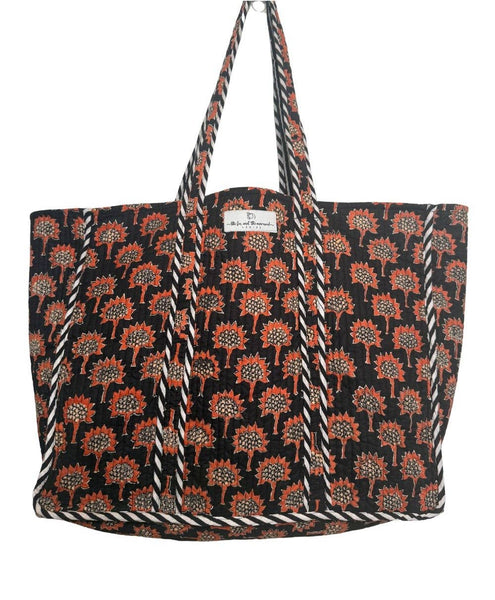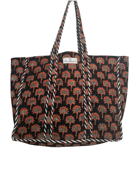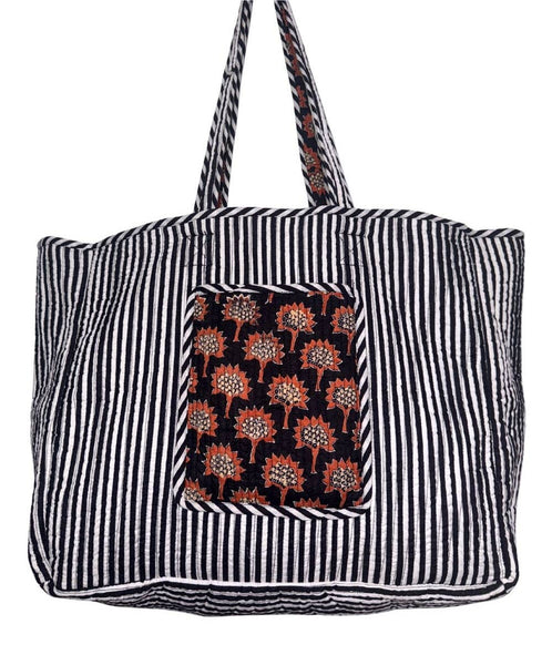 Block printed and reversible tote bag featuring a large interior pocket. Made from super soft quilted cotton. Perfect for a day at the beach, yoga, shopping or a quick weekend getaway.